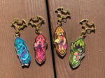 Combining gold foil detail with 3D! These are keychain versions of my stained glass Robin enamel pins. They are 3" tall acrylic keychains with gold-plated bat-shaped clasps and covered in epoxy. Each keychain has gold foil detailing and also a slight layered effect, with the characters on top of the acrylic and the background behind.